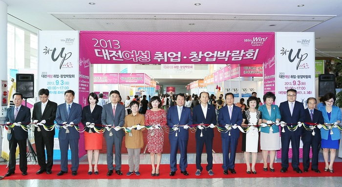 염홍철 시장은 3일 대전시청 1층 로비에서 개최된 2013 대전 여성·창업 박람회에서 참석자들과 테이프컷팅을 하고 있다.