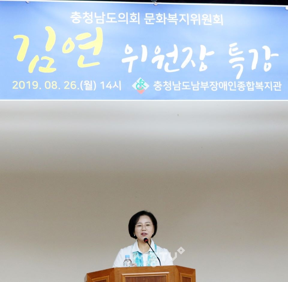 충남도의회 김연 문화복지위원장(천안7)은 26일 충남 남부장애인종합복지관에서 ‘사회복지사의 소진 예방’을 주제로 특강을 펼쳤다.