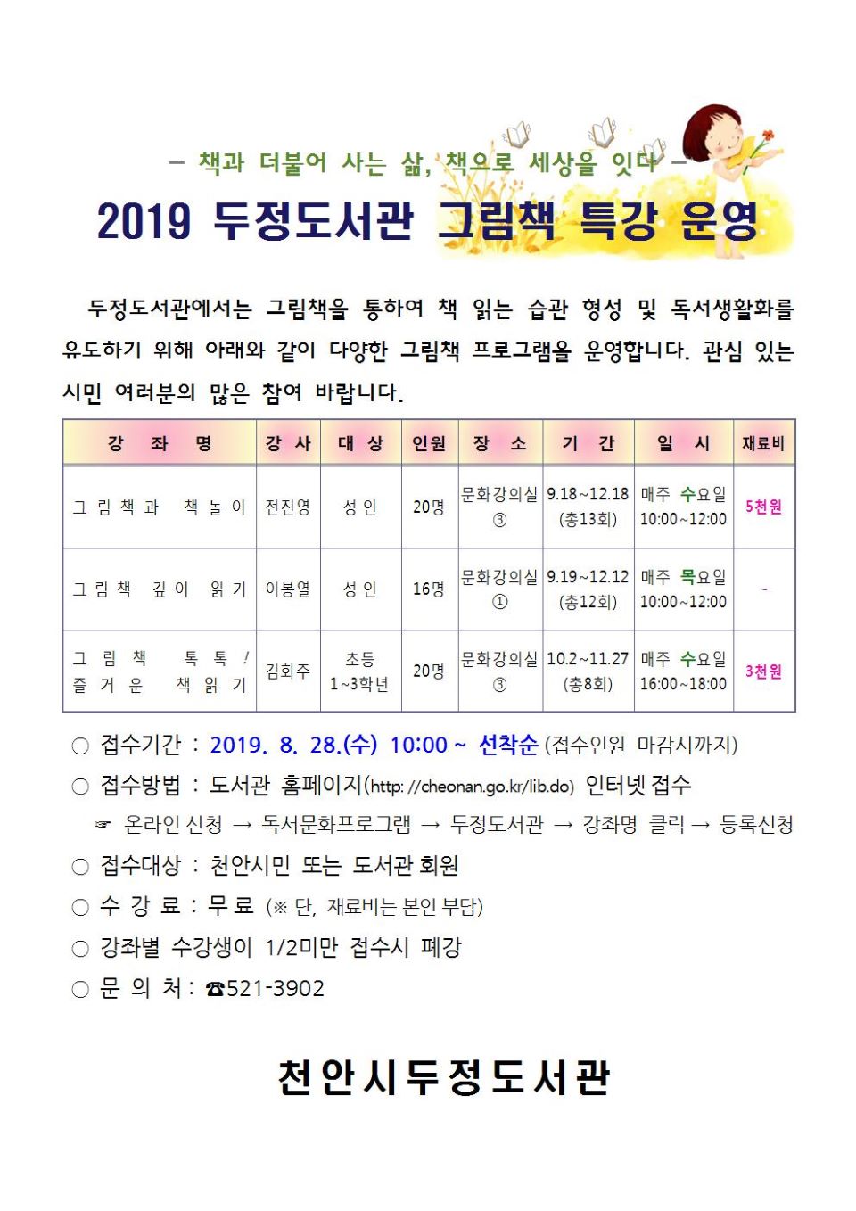 천안시 두정도서관(관장 문현주)은 성인과 초등학생들의 책 읽는 습관 형성 및 독서생활화를 유도하기 위해 9월부터 12월까지 다양한 그림책 특강을 운영한다.