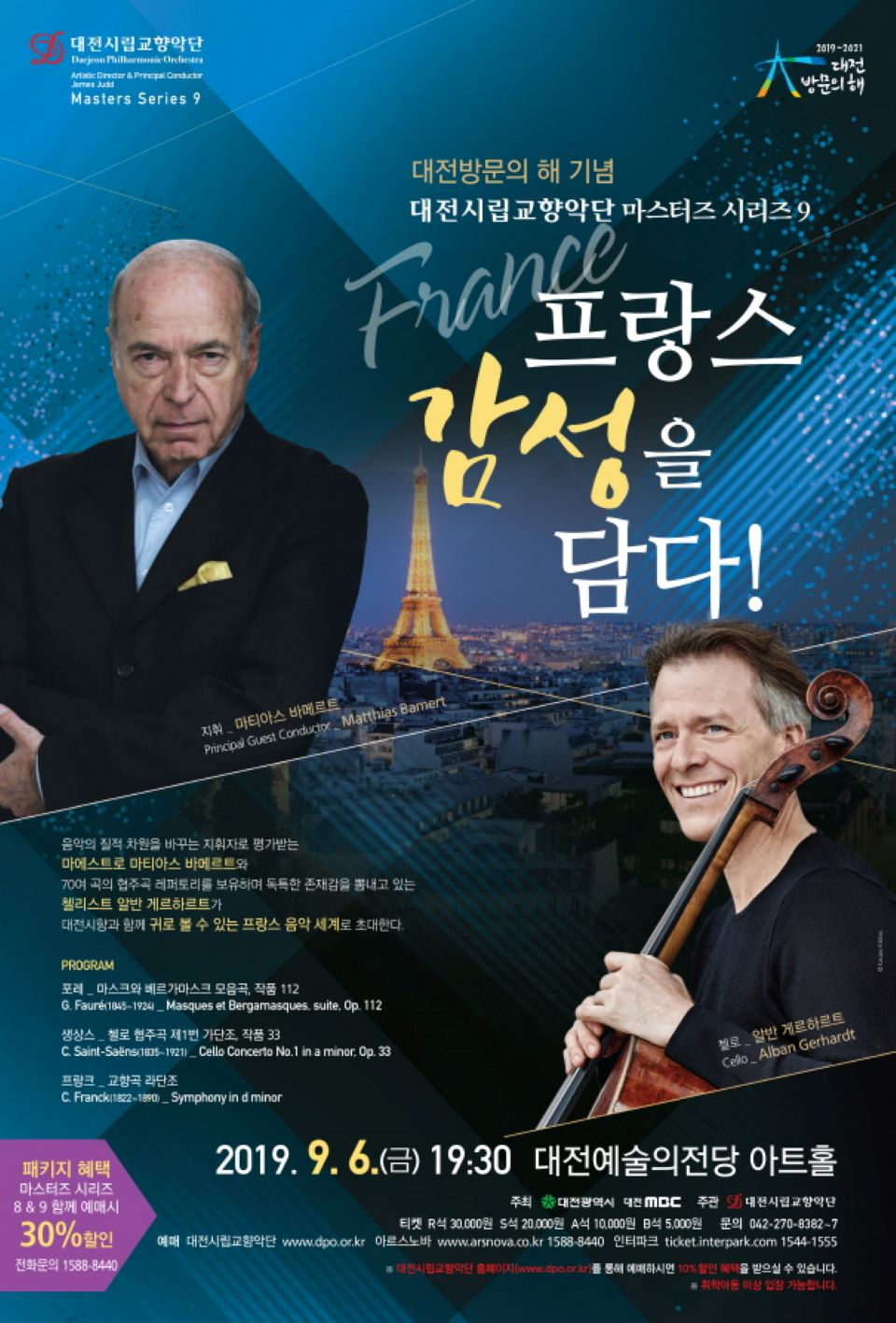 최정상급 프랑스 근대음악의 세계로 안내할 이번 무대는 음악의 질적 차원을 바꾸는 지휘자로 평가받는 마에스트로 마티아스 바메르트 수석 객원지휘자와 익숙한 작품을 새롭게 해석하는 능력으로 국제무대에서 독특한 존재감을 뽐내고 있는 첼리스트 알반 케르하르트가 대전시향과 호흡을 맞춘다.