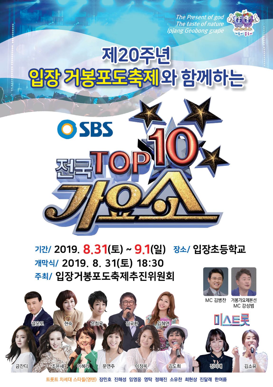 축제 첫날인 31일에는 오후 6시 30분 개막식을 시작으로 설운도, 현숙, 문희옥, 김국환, 김혜연과 최근 미스트롯에 출연해 인기를 얻고 있는 정미애, 김소유 등 국내 최고의 가수들이 출연하는 ‘SBS 전국TOP10가요쇼’공연의 막이 올라 축제 분위기를 고조시킨다.