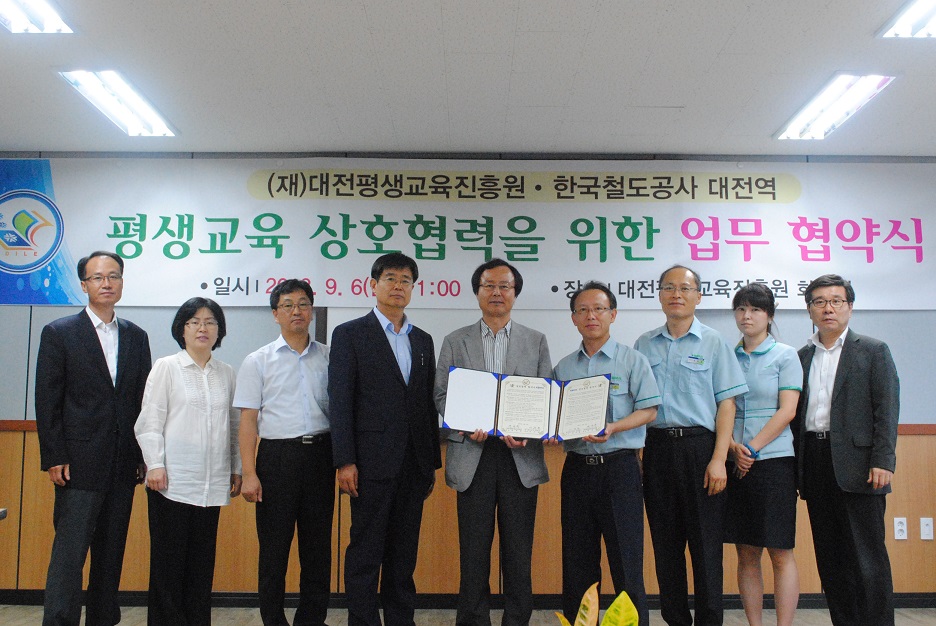 (재)대전평생교육진흥원(원장 연규문)은 6일(금) 오전 11시 대전평생교육진흥원 회의실에서 한국철도공사 대전역(역장 이우현)과 평생교육 상호협력을 위한 업무협약을 체결했다.