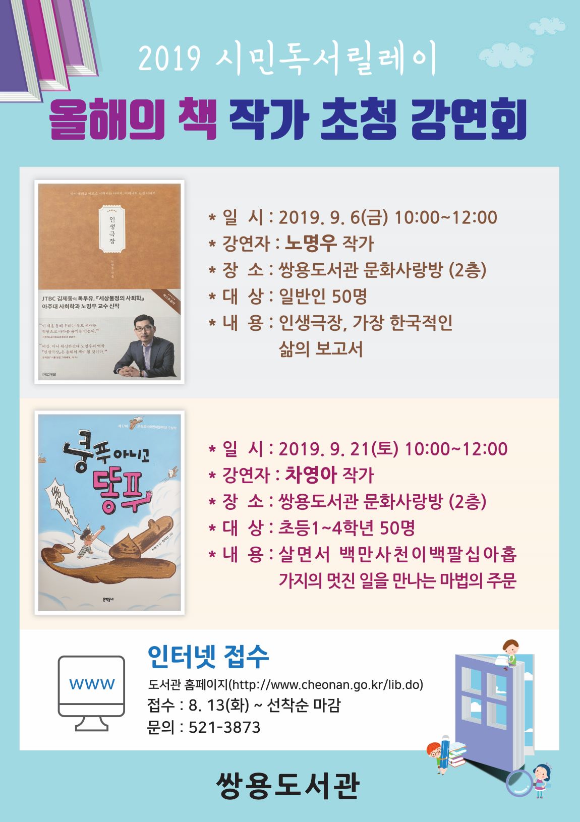 천안시쌍용도서관은 오는 9월 6일과 21일 올해 시민독서릴레이에 선정된 도서의 작가 초청 강연회를 개최한다고 밝혔다.