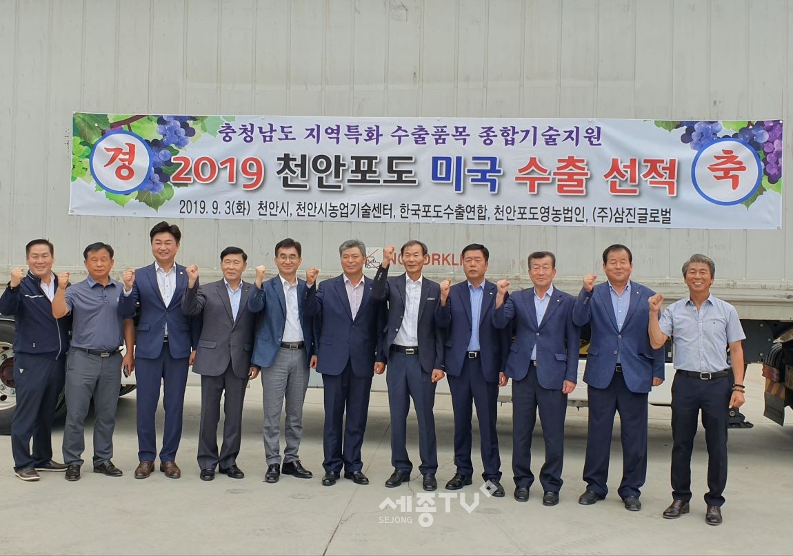 천안시와 천안포도영농조합법인은 3일 성거읍에 위치한 천안포도수출전문유통센터에서 조합원과 수출 관계기관 등 40여 명이 참석한 가운데 ‘천안 하늘그린 거봉포도 수출 선적식’을 열었다.
