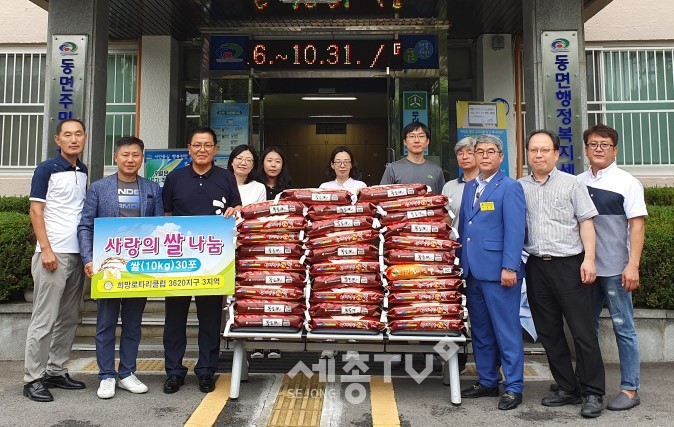 천안시 동면(면장 권욱)은 희망로타리클럽 3620지구 3지역(회장 오규훈)이 4일 홀로 사는 노인과 어려운 이웃에 전달해 달라며 쌀 10kg 30포(90만원 상당)를 전달하는 뜻깊은 나눔 행사를 가졌다고 밝혔다.