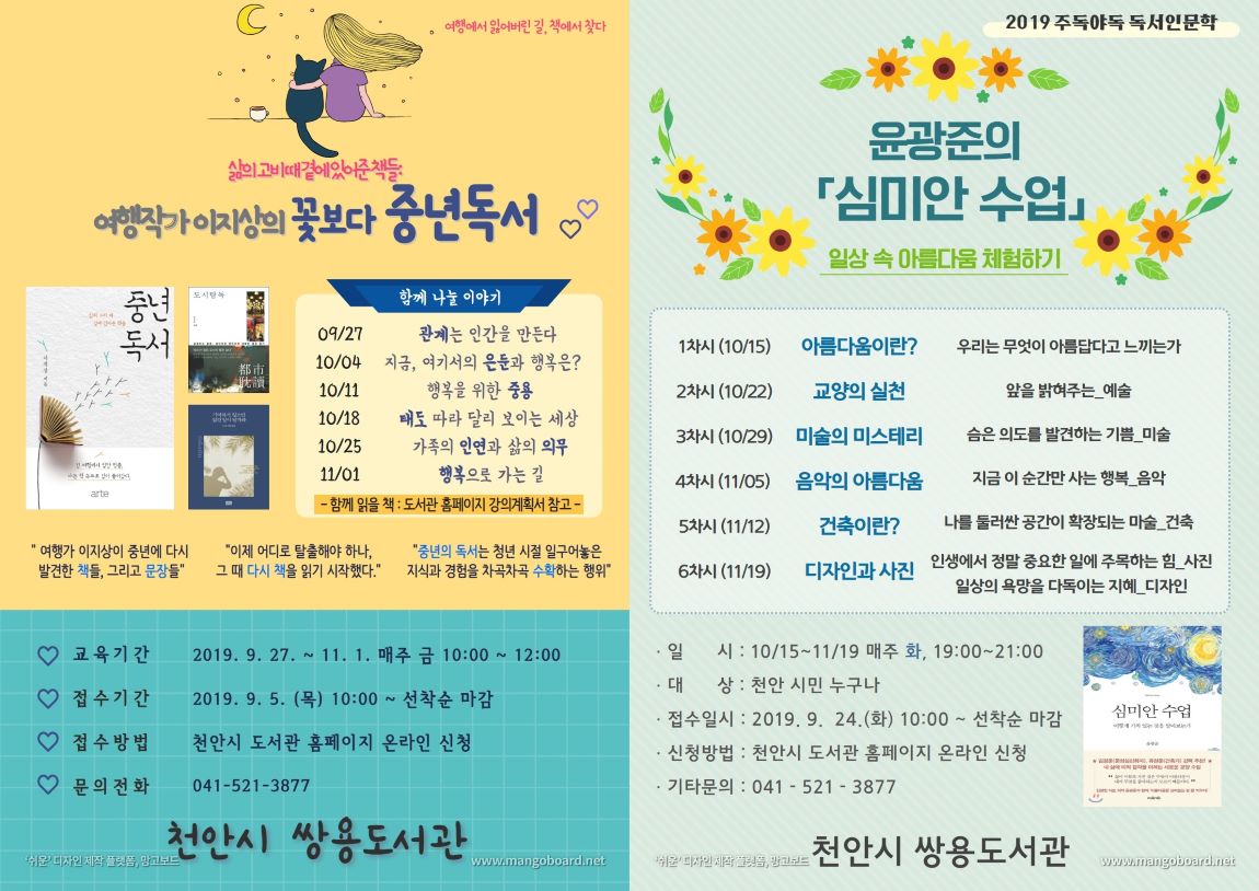 ‘중년독서’는 천안시 도서관 홈페이지를 통해 선착순 신청 받고 있으며, ‘심미안 수업’은 오는 24일 오전 10시부터 선착순 신청 받는다.