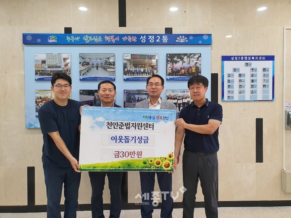 천안준법지원센터는 6일 추석명절을 맞아 관내 어려운 이웃을 위해 직원들이 모은 성금 30만원을 성정2동 행정복지센터에 기탁했다.