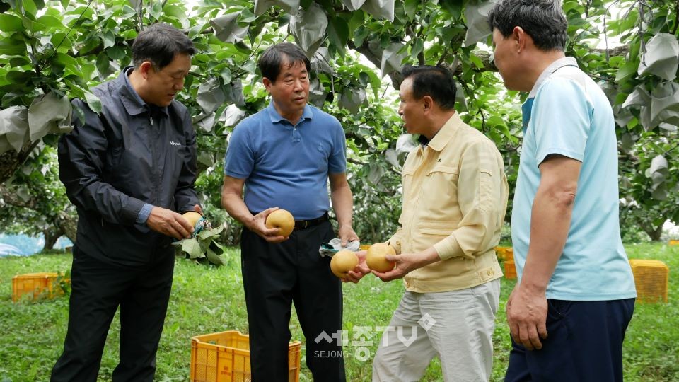 구 시장은 이날 오전 직산읍 석곡리 과수 농가(최예천 씨)를 방문해 태풍에 따른 낙과 등 피해예방을 위한 사전대비를 철저히 해줄 것을 당부하고 농가의 애로사항을 청취했다.
