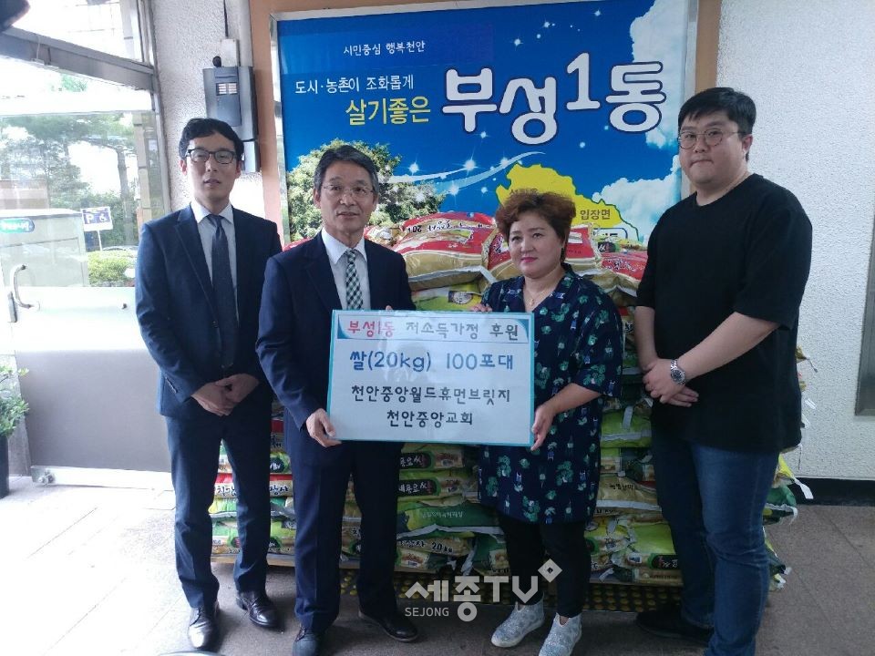천안시 부성1동(동장 서병훈)은 지난 6일 부성1동 천안중앙교회가 지역의 소외된 이웃을 위해 20㎏ 쌀 100포를 기부했다고 밝혔다.