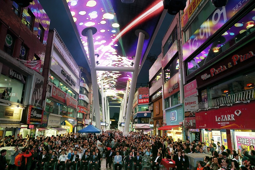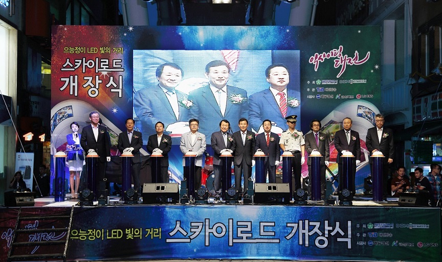 염홍철 대전시장은 6일 오후 6시 30분 중구 으능정이 거리에 조성한 길이 214m, 폭 13.3m, 높이 20m의 국내 최대 규모의 초대형 LED영상시설인 대전스카이로드 개장식 참석했다. 민선 5기 약속사업으로 추진한 이번 사업을 계기로 원도심 활성화의 원동력이 될 것으로 기대된다.