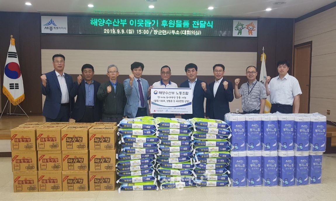 세종특별자치시 장군면(면장 임윤빈)이 9일 해양수산부 노동조합, 농협정부세종청사금융센터 및 수협중앙회세종지점으로부터 추석명절 후원물품을 전달 받았다.