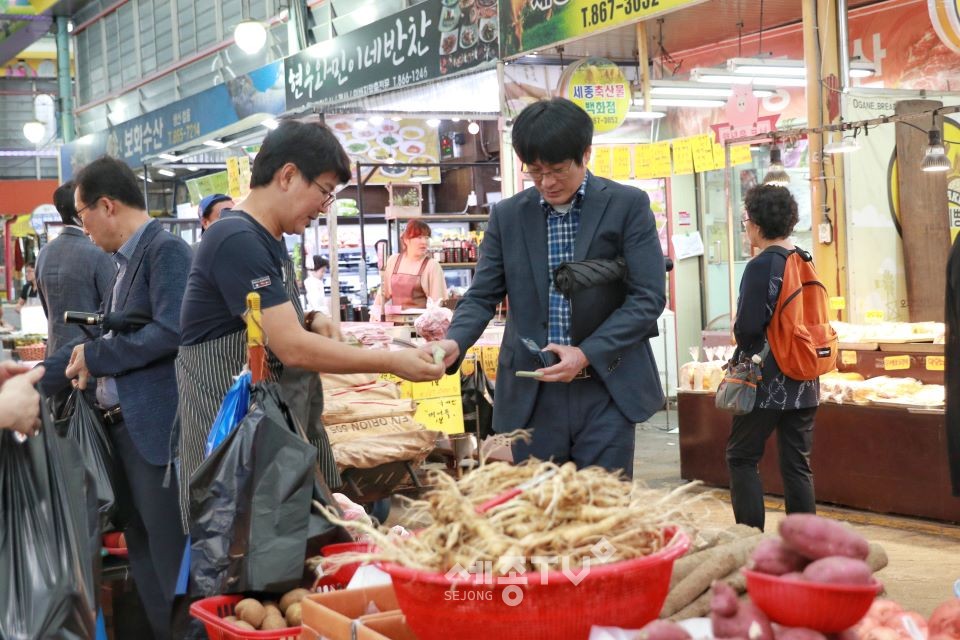 최교진 세종시교육감과 세종시교육청 직원들이 9일 다가오는 민족 고유의 대명절인 추석을 앞두고 지역경제 살리기에 보탬이 되기 위해 조치원 전통시장을 방문했다.