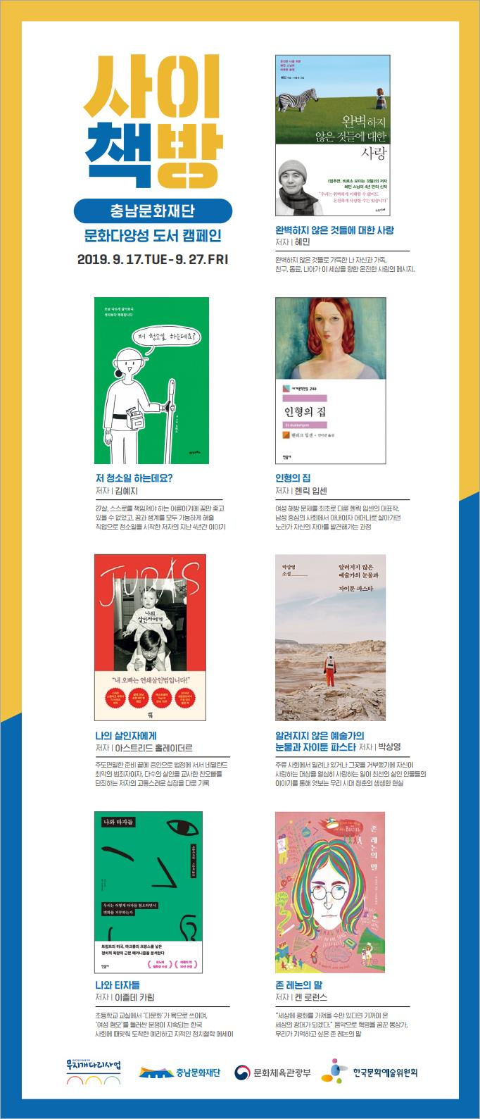 충남문화재단(대표이사 이명남)은 오는 17일부터 27일까지 문화다양성 도서 캠페인 <사이책방>을 진행한다.