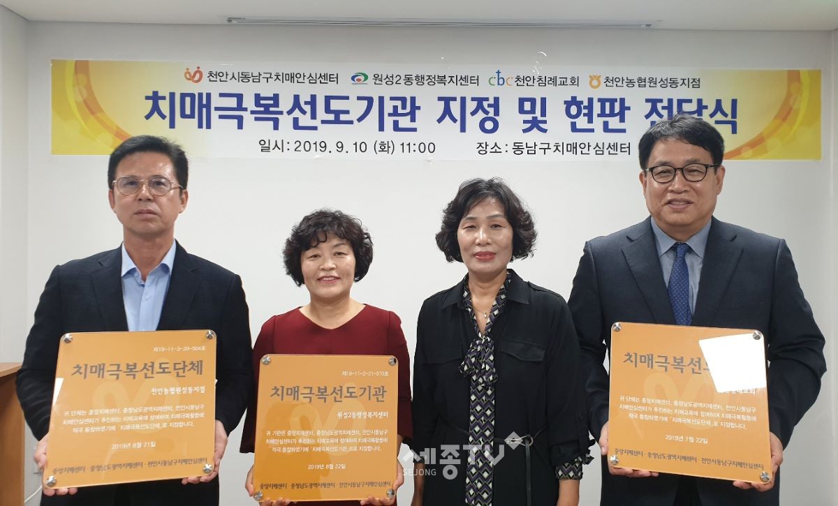 천안시동남구치매안심센터는 10일 원성2동 내에 위치한 3개 기관을 치매극복선도 기관·단체로 지정하고 현판을 전달했다.