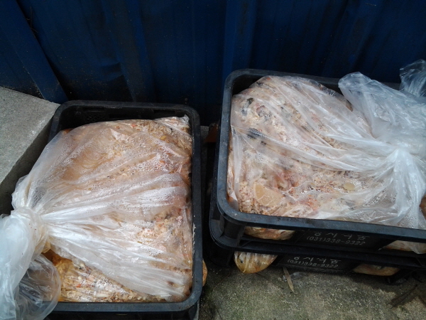 휴게소내 식당 등에서 쏟아져 나오는 음식물 쓰레기를 일반폐기물과 섞어 투명비닐봉투에 내놓아 쓰레기 분리수거 정책을 위반하고 있다.