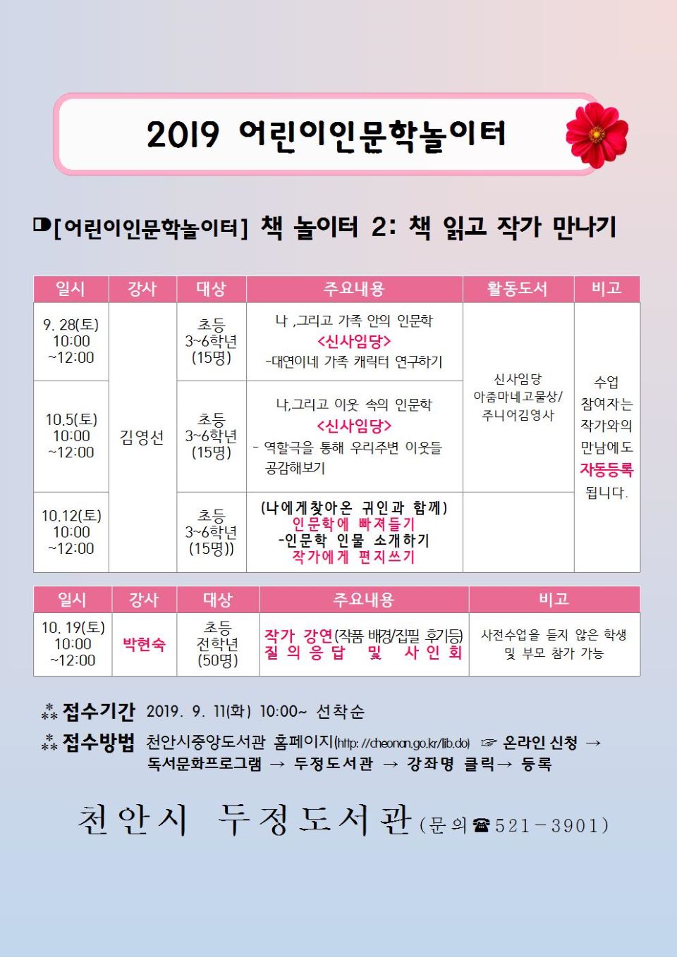신청·접수는 선착순으로 천안시 도서관 홈페이지(http://www.cheonan.go.kr/lib.do)에서 하면 되고, 기타 자세한 사항은 두정도서관(☎521-3901)으로 문의하면 된다.