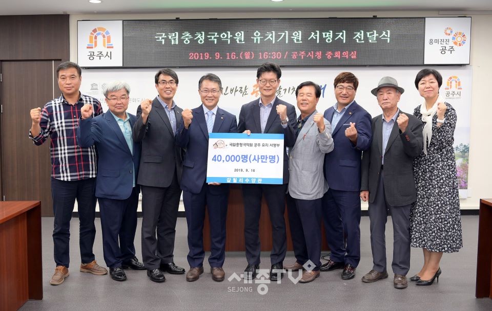 공주시(시장 김정섭)는 지난 16일 시청 상황실에서 갈릴리수양관(목사 정태교)으로부터 국립충청국악원 공주 유치를 지지하는 4만인 서명부를 전달받았다. (사진제공)