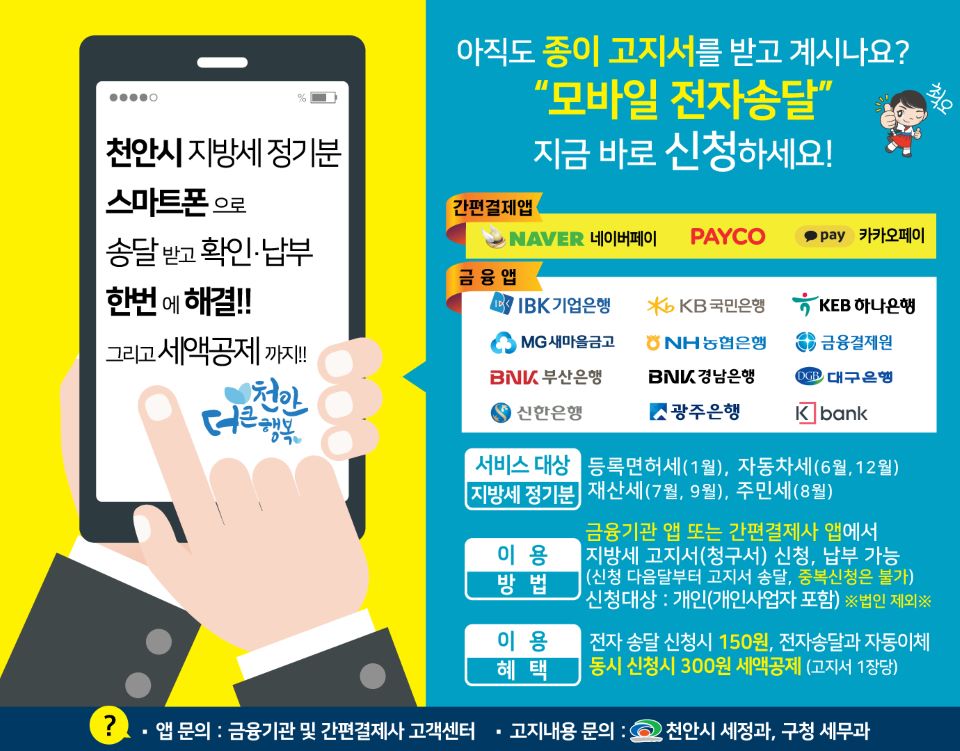 시는 지난해 12개사 금융기관 앱(App)을 통해 지방세를 납부하는 제도를 시작했으며, 올해 7월부터는 3개사 간편결제사인 카카오톡, 네이버, 페이코 앱을 순차적으로 도입해 모바일 전자송달을 시행하고 있다.