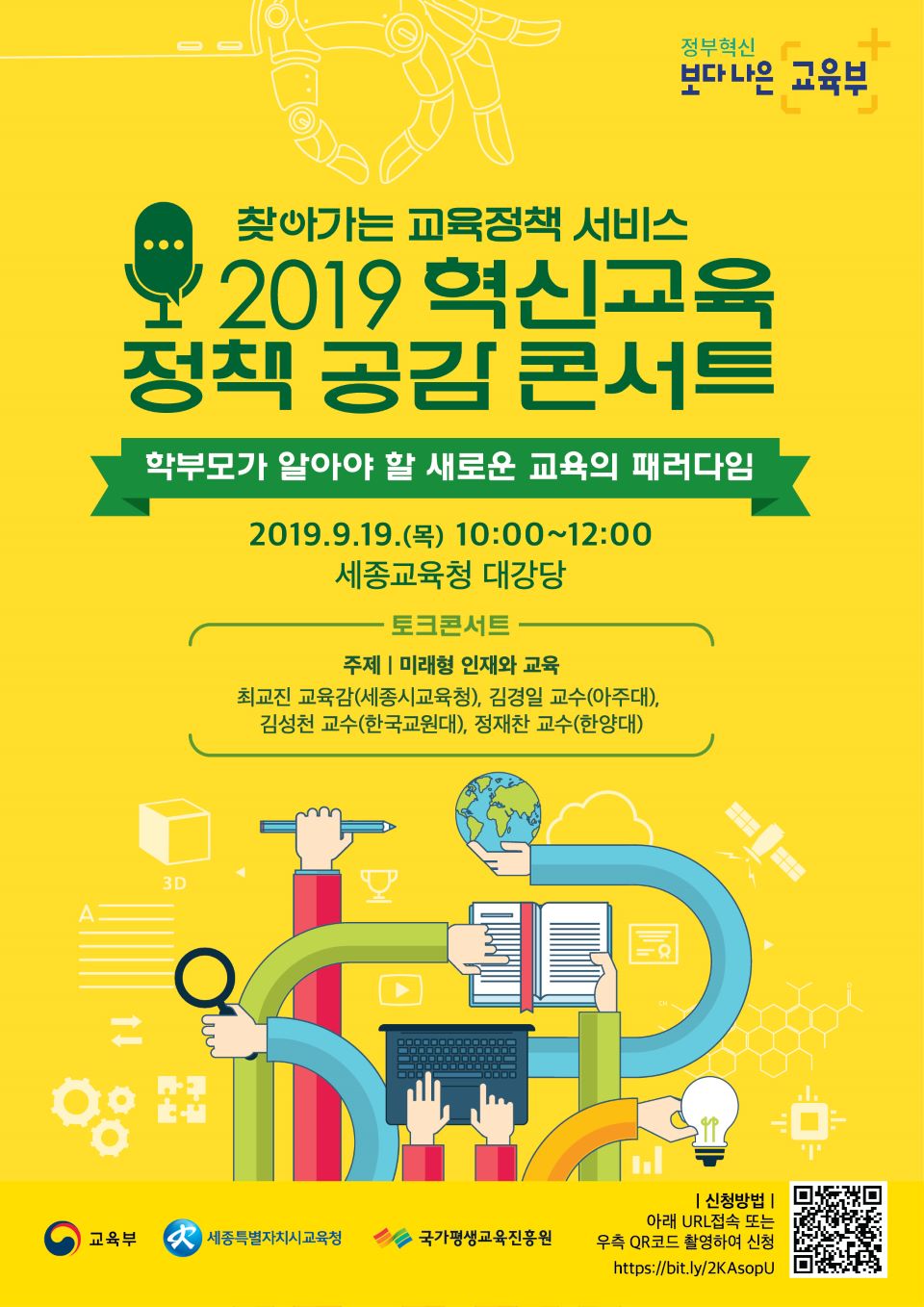 세종특별자치시교육청(교육감 최교진, 이하 세종시교육청)은 9일 세종시교육청 대강당에서 A씨와 같은 걱정을 하고 있는 학부모를 위해 ‘학부모가 알아야 할 새로운 교육 패러다임’이라는 주제로 「2019 혁신 교육 정책 공감 콘서트」를 실시했다고 밝혔다.