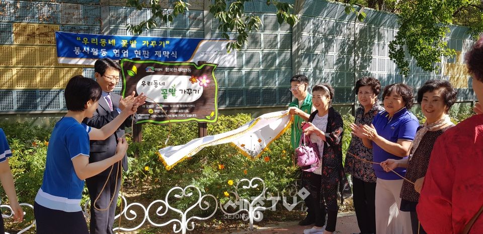 천안시 부성1동 새마을지도자협의회(회장 김근섭), 새마을부녀회(회장 이영숙)와 국민체육진흥공단 경륜경정총괄본부천안지점(지점장 최용필)은 18일 두정동 152-1 소재 새마을 화단에서 ‘우리동네 꽃밭 가꾸기’ 현판 제막식을 열었다.