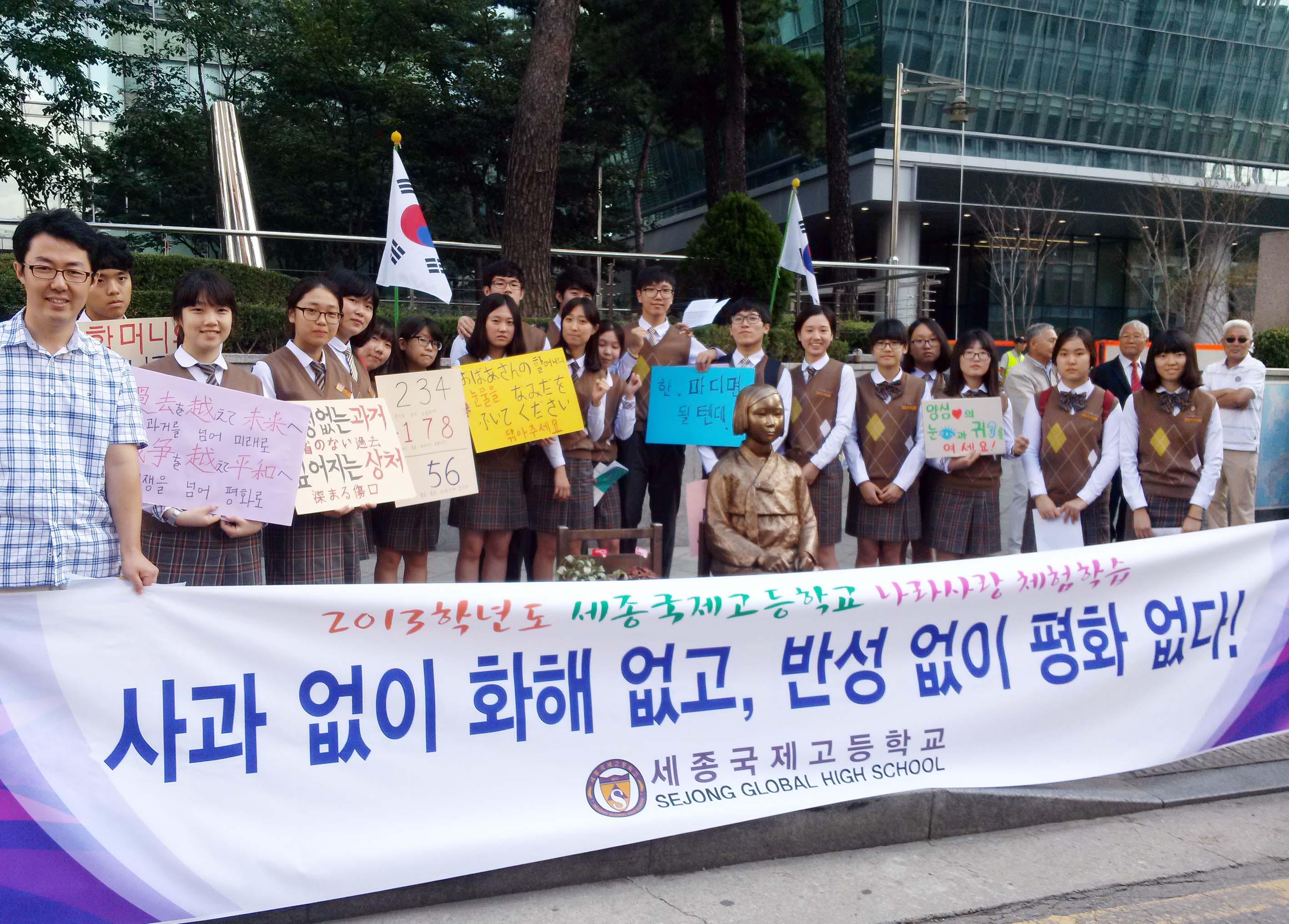 세종국제고의 사이버외교사절단을 표방하는 자율동아리 ‘반크(VANK)’와 역사동아리 ‘뿌리와 샘’ 학생 20여명은 25일 11시 일본 대사관 앞에서 열리는 종군 위안부 피해자들의 수요 집회에 참석하고, 한.미.일 정상에게 공개편지를 보냈다.