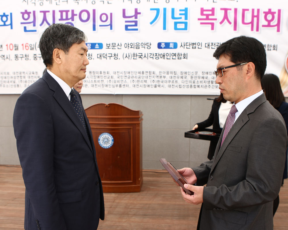대전시의회 한근수의원(산업건설위원장, 새누리당, 유성구 4)은 16일 보문산 야외음악당에서 개최된‘제34회 흰지팡이의 날 기념 복지대회’에서, 시각장애인의 복지 증진을 위해 노력한 것에 대한 감사의 뜻으로 사단법인 대전광역시시각장애인연합회 김연웅 회장으로부터 감사패를 받았다.