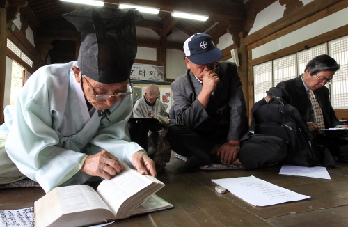 ▲ 우암 송시열 선생 탄신 406주년을 기념해 19~20일 우암사적공원 일원에서 제18회 우암문화제가 개최된 가운데 한시백일장에 참가한 어르신들이 옥편 등을 참고하며 한시를 짓고 있다