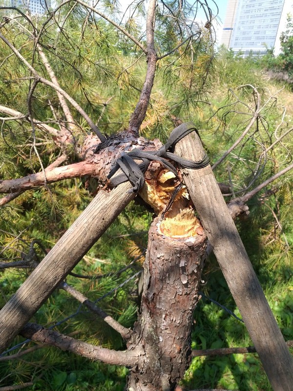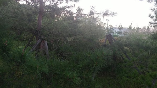 또한 조경수를 지탱해 주는 지지대가 부러져 있거나 부식돼 지지대 역할을 전혀 하지 못하고 있다. 지지대가 부러진 조경수는 버티지를 못하고 같이 공원안에 쓰러진 채 방치돼 흉측한 몰골을 드러내고 있다.