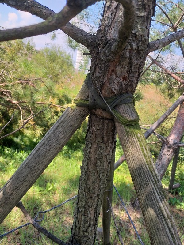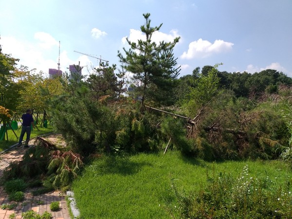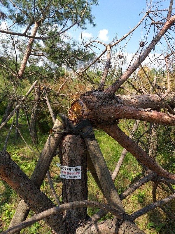 봄뜰근린공원 조경수, 지지대 부러진채 방치 고사상태