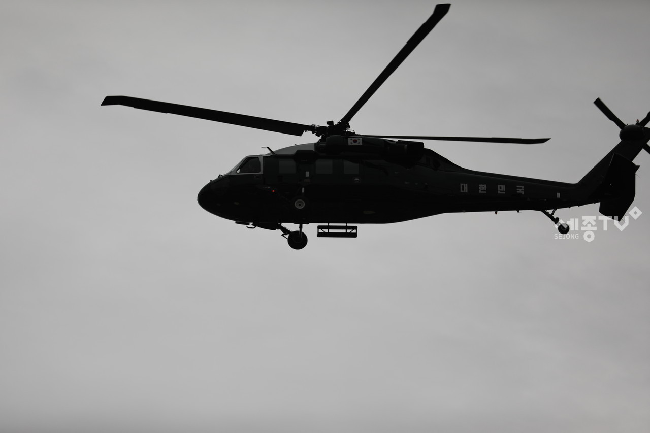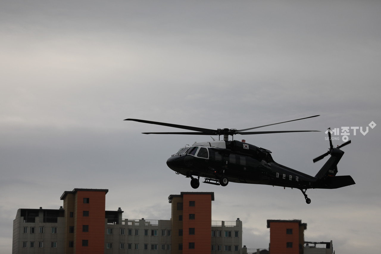 방문 행사를 마친 문대통령 수행단을 태운 헬기가 도청 남문광장에서 이륙하고 있다.