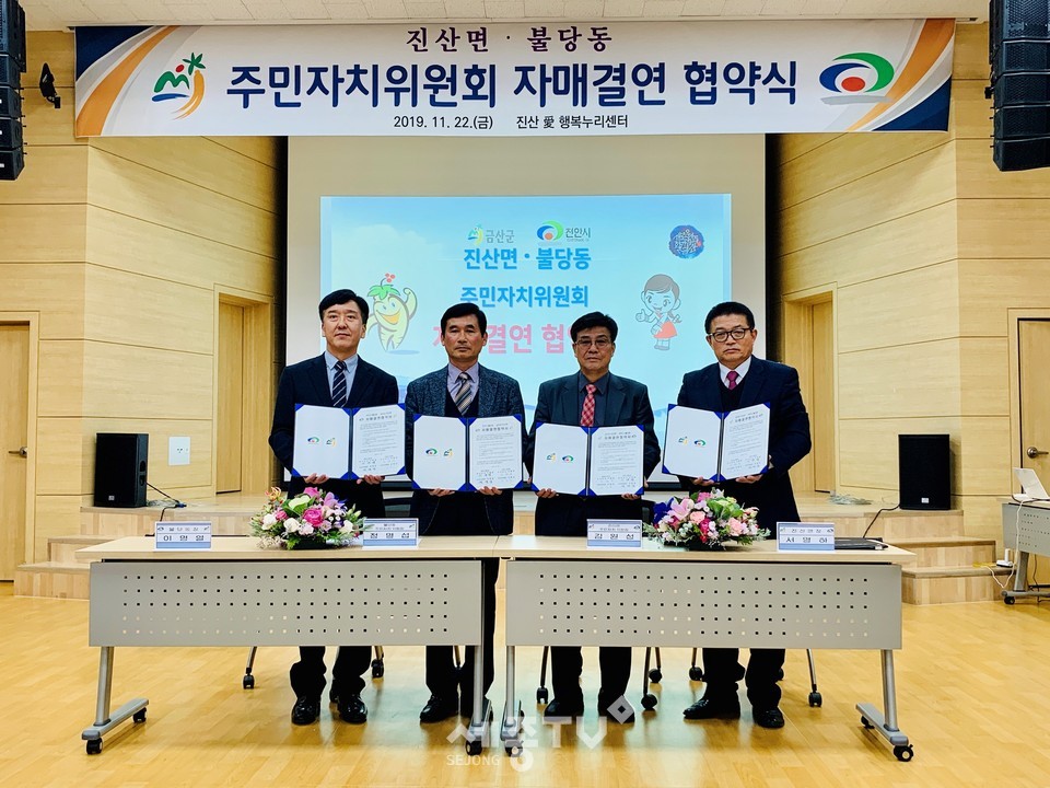 천안시 불당동 주민자치위원회(위원장 정명섭)와 금산군 진산면 주민자치위원회(위원장 김원성)가 22일 진산면에 위치한 ‘진산愛행복누리센터’에서 자매결연 협약식을 가졌다.