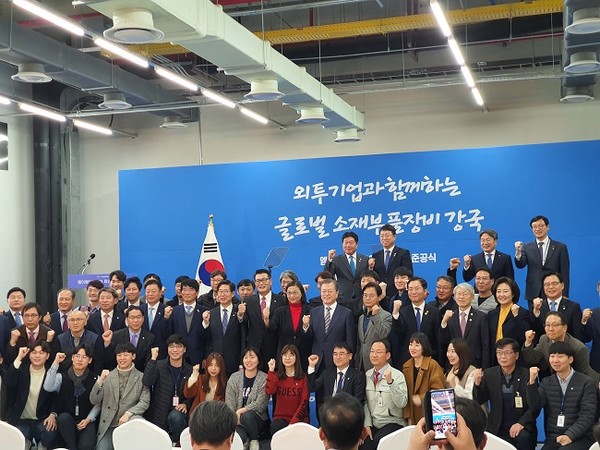 ‘외투기업과 함께 하는 글로벌 소재·부품·장비 강국’을 주제로 연 이날 준공식에는 문재인 대통령과 양승조 지사, 성윤모 산업통상자원부 장관, 최기영 과학기술정보통신부 장관, 도리스 슈 글로벌웨이퍼스 회장과 조찬래 엠이엠씨코리아 대표 등 150여명이 참석했다.