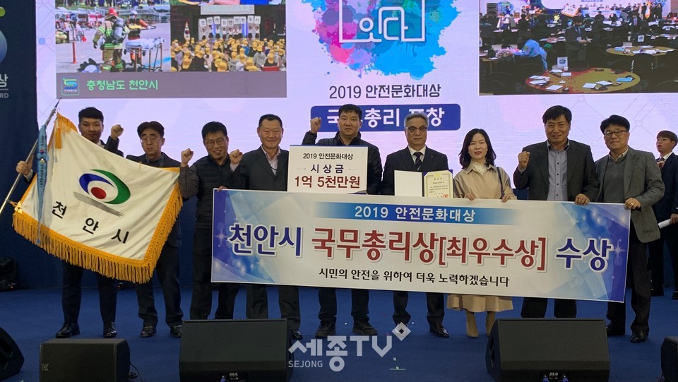 천안시가 28일 세종컨벤션센터에서 열린 ‘2019 안전문화대상’에서 최우수 기관에 선정돼 국무총리 표창을 받았다. 시상금으로는 사업비(재난안전관리특교세) 1억5000만원을 획득하게 됐다.