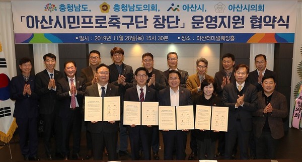 도는 28일 아산터미널웨딩홀에서 ‘아산시민프로축구단 창단 운영 지원 협약식’을 열고, 아산무궁화축구단의 명맥을 이을 새로운 시민프로축구단 창단 지원에 나선다고 밝혔다.