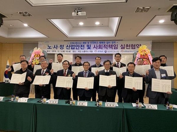 도는 3일 예산 덕산스플라스 리솜에서 김용찬 행정부지사, 이명로 대전고용노동청장, 충남중소기업연합회 및 소속사업장 등이 참석한 가운데, ‘노·사·정 산업안전 및 사회적 책임 실천협약’을 체결했다.