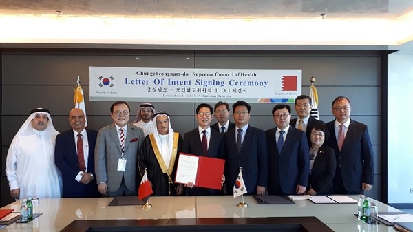 시장 개척과 지방외교 다변화를 위해 중동을 출장 중인 양승조 지사는 4일 바레인왕국 마나마 아트 로타나 호텔에서 샤이크 모하메드 빈 압둘라 알 칼리파 바레인 보건최고위원회(SCH) 의장과 국제 교류·협력 의향서(LOI)를 교환했다.