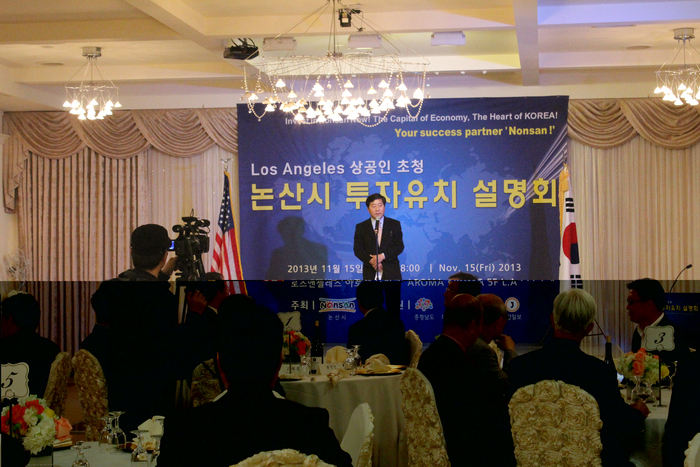 논산시가 의욕적으로 기업유치와 강경젓갈 등 지역 농특산물의 미주시장 개척을 위한 이날 설명회에는 LA지역의 방기선 부총영사, 배무한 한인회장, 조남태 충청향우회장, 고계홍 미주 중앙일보 회장, 박동형 KOTRA 무역관장, 이종환 충남도 사무소장, 케니박 상공회의소 회장, 이병철 코메리카 회장 등 주요내빈이 참석했다.