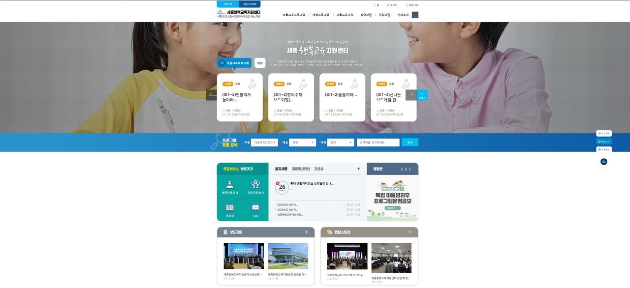 센터 홈페이지는 세종시 아동·청소년들이 여러 기관에 산재해 있는 체험과 마을 방과 후 교육정보를 쉽게 얻을 수 있고, 읍면동 주민자치프로그램도 별도 로그인 없이 신청할 수 있도록 구축했다.