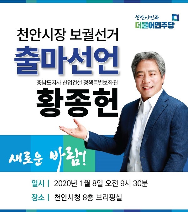 황종헌 현 양승조 충남도지사 산업건설 정책특별보좌관(52)이 4월 15일 21대 총선과 함께 치러지는 천안시장 보궐선거에 도전한다.