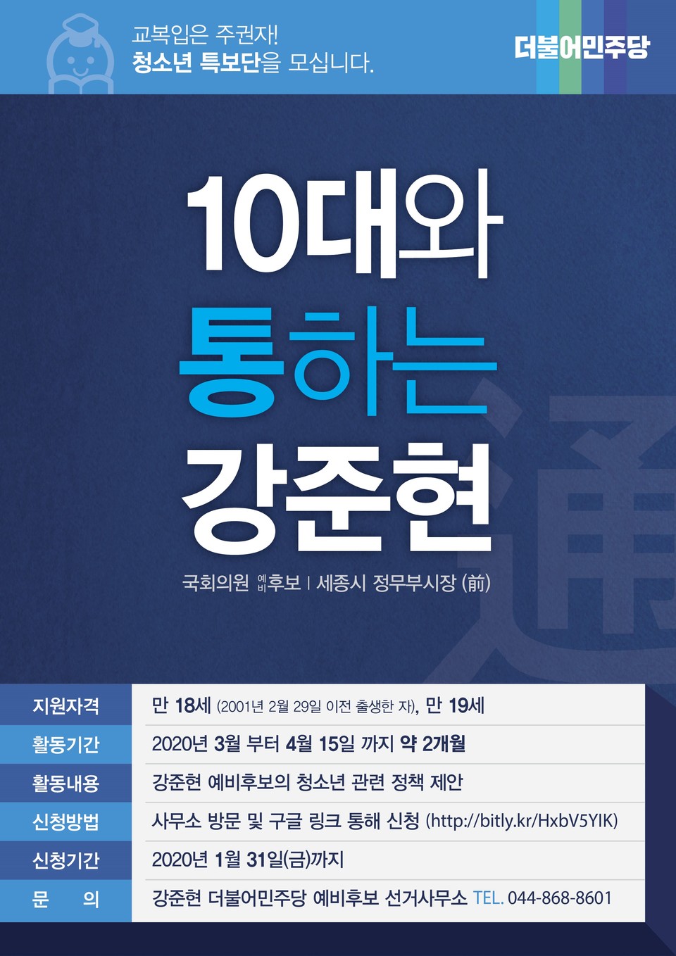 강준현 더불어민주당 세종지역구 국회의원 예비후보는 만18세 선거연령 하향을 환영하면서 청소년 주권자의 주체적인 정책 제안을 듣기위해 이달 31일까지 ‘청소년 특보단’을 모집한다.