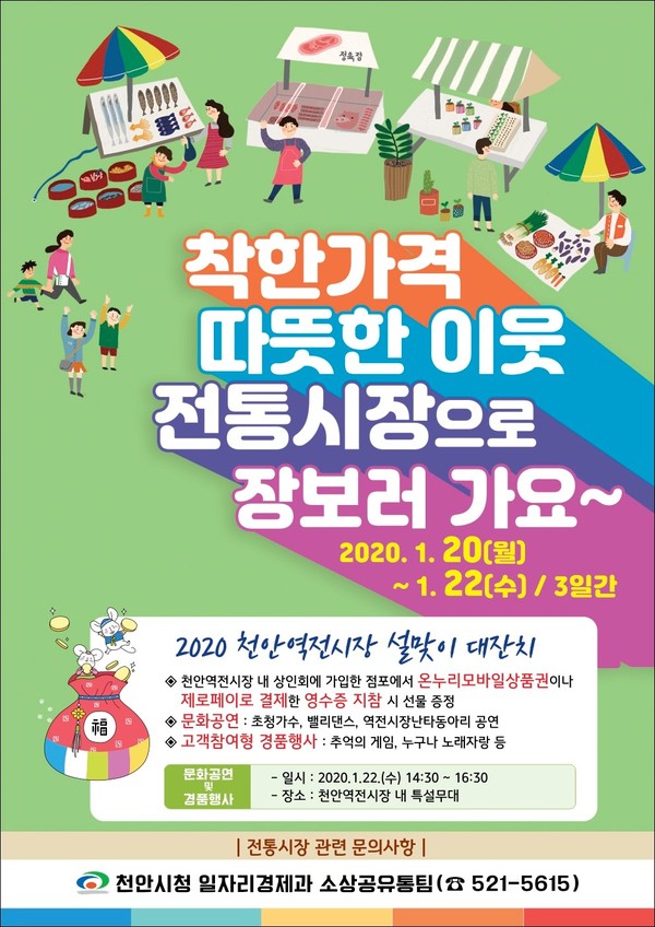 천안시가 민족 최대 명절인 설을 맞이해 전통시장과 직거래장터, 천안농수산물도매시장 이용 홍보에 나섰다.