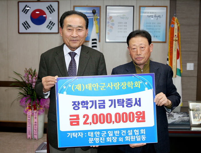 충남 태안군일반건설협회(회장 문영진 외 회원일동)는 지난 28일 태안군수실에서 지역의 미래를 이끌어갈 우수 인재 육성에 사용해 달라며 태안군사랑장학회(이하 장학회)에 200만원을 지정기탁 했다.