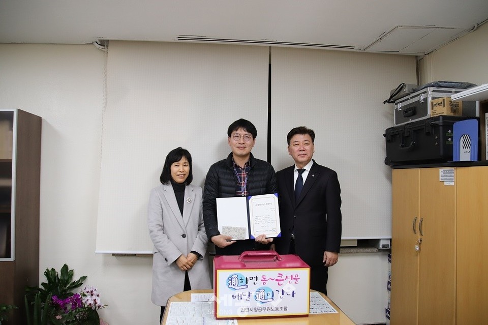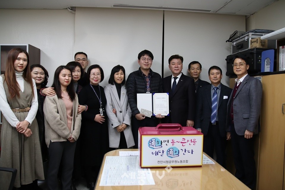 배달통에는 상품권과 부서원들의 간식 그리고 노동조합원들의 마음을 담은 표창장이 담겨 사측 대표로 참석한 구만섭 천안시장 권한대행이 직접 김 주무관에서 전달했다.