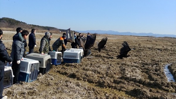 충남도는 5일 충남야생동물구조센터가 서산시 부석면 서산버드랜드 앞 농경지 일원에서 환경부 지정 멸종위기종 2급인 야생독수리 9마리를 자연의 품으로 되돌려 보냈다고 밝혔다.