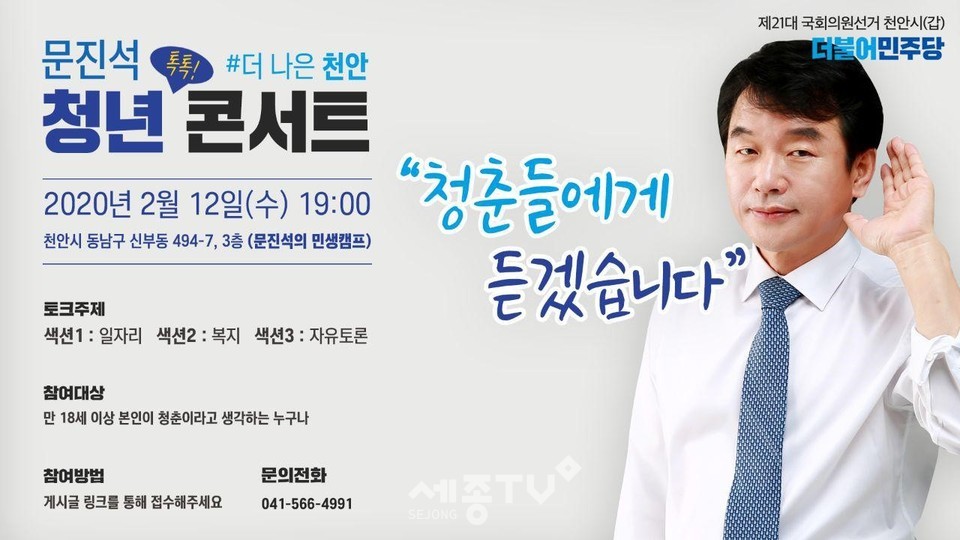 문진석 더불어민주당 천안갑 국회의원 예비후보가 2월 12일(수) 저녁 7시 동남구 신부동에 위치한 예비후보 사무실에서 ‘청년 토크콘서트’를 개최한다.