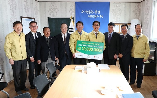 도는 11일 아산 현장집무실 접견실에서 양승조 지사와 산림조합중앙회 최창호 회장 등 7명이 참석한 가운데 ‘신종 코로나 아산 인재개발원 예방 지원금 1000만 원 전달식’을 가졌다.