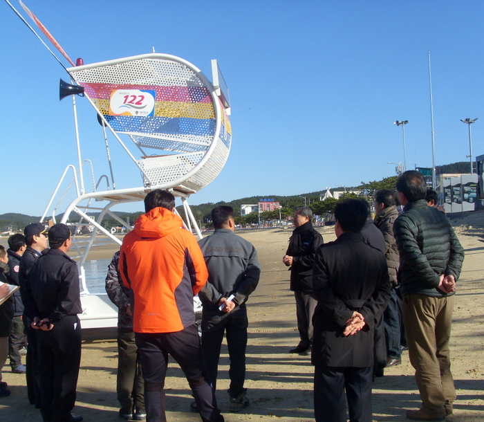 또한 이날 해양경찰연구소가 조석간만의 차가 큰 해수욕장에서 효율성이 떨어지는 고정식 망루의 단점을 보완해 개발한 ‘이동식 망루’의 성능시범을 보여 해수욕장 안전에 대한 기대감을 높였다.