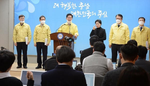 양승조 지사는 25일 도청 프레스센터에서 기자회견을 열고 △도내 확진자 추가 발생 현황 및 대응 △그동안 방역 추진 상황 △확산 방지 대책 △단계별 조치 계획 등을 발표했다.