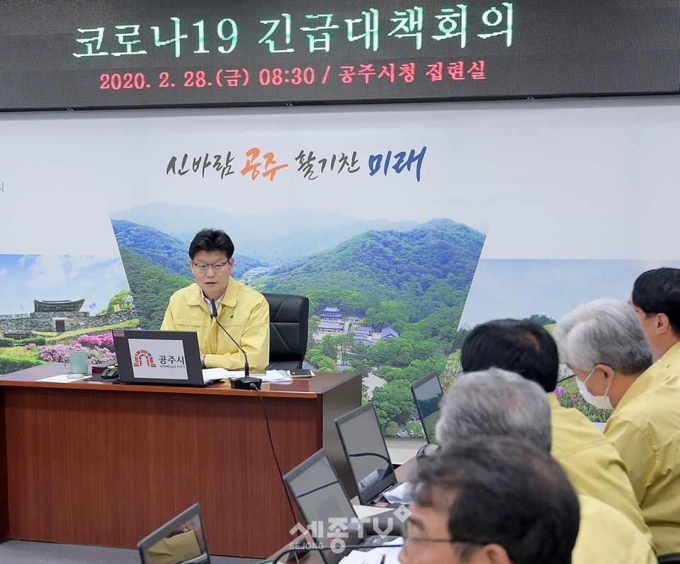 김정섭 공주시장이 28일 시청 집현실에서 코로나19 긴급대책회의를 주재하고 총력 대응태세 유지를 당부했다.