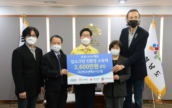 양승조 충남도지사는 28일 도청 접견실에서 한국전해수시스템과 ‘코로나19 예방 물품 전달식’을 개최했다.